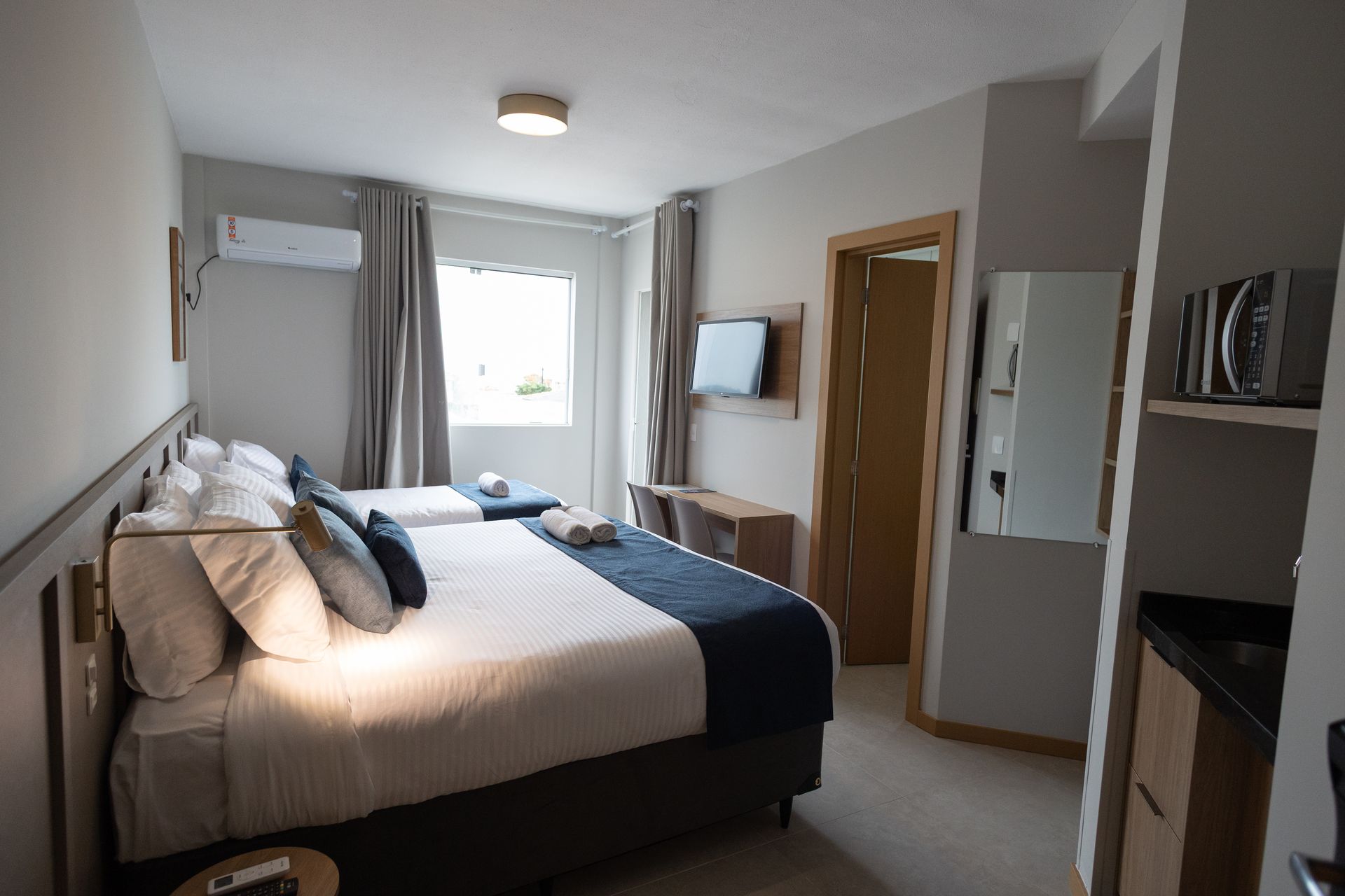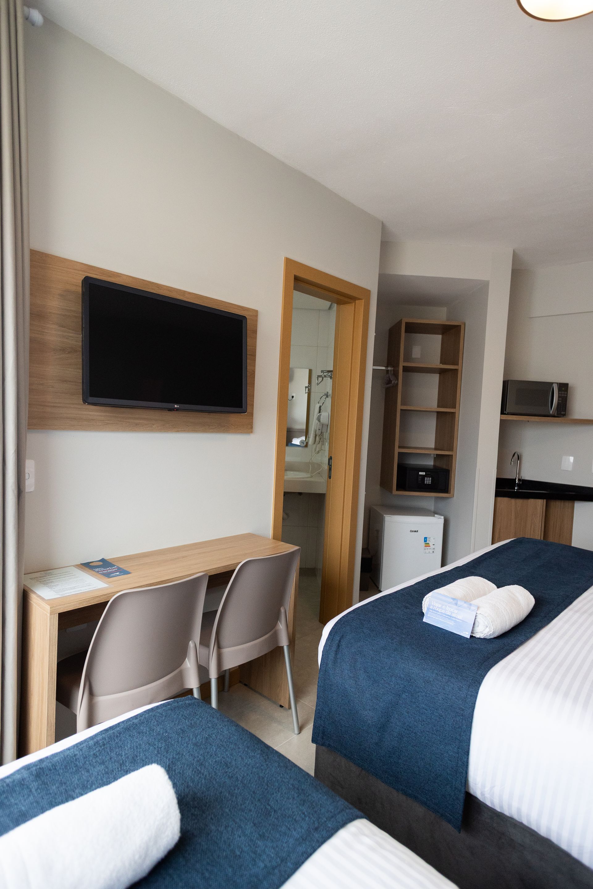 Todos com ar condicionado frio e quente, cama box, TV smart, frigobar (sem bebidas), pia, micro-ondas, cofre, banheiro e internet wireless grátis. Na recepção possuímos uma Máquina automática de vendas com bebidas e petiscos.